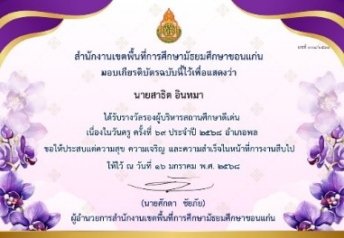 นายสาธิต อินทมา รองผู้อำนวยการโรงเรียนพล ได้รับรางวัล “ผู้บริหารสถานศึกษาดีเด่น” สังกัดสำนักงานเขตพื้นที่การศึกษามัธยมศึกษาขอนแก่น เนื่องในวันครู ครั้งที่ 69 ประจำปี |